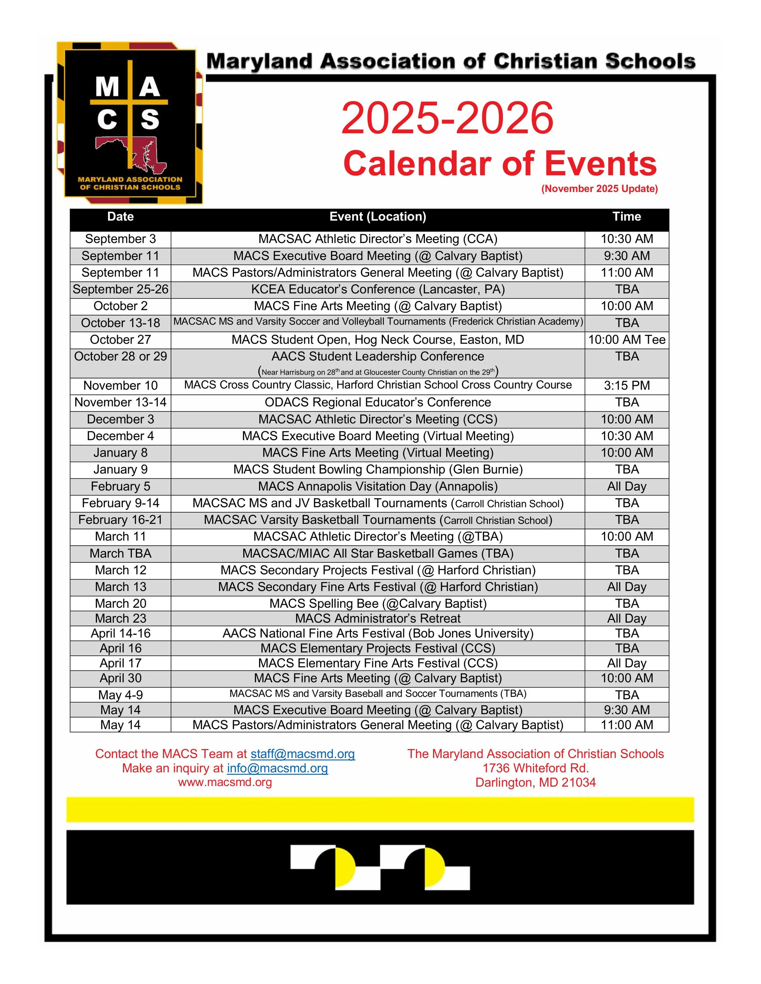 The Maryland Association of Christian Schools, since its founding, has been led by pastors and administrators intent upon maintaining quality education to Christian schools. The Executive Board of Directors is responsible for the total operation of the Association. The Executive Board also presents a candidate for the General Meeting to hire as an Executive Director to organize and manage all MACS activities.